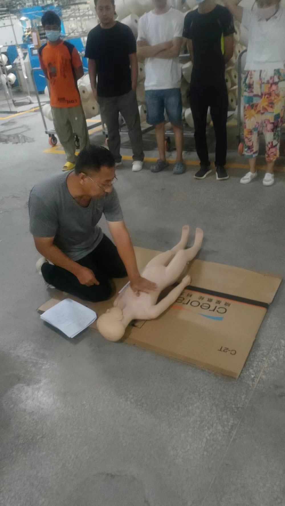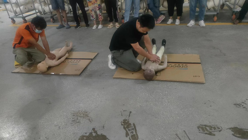 隨后,公司組織員工進(jìn)行了休克、昏迷緊急救護(hù)演練,呼吸心跳驟停緊急救護(hù)演練,所有員工參加了心肺復(fù)蘇操作訓(xùn)練。